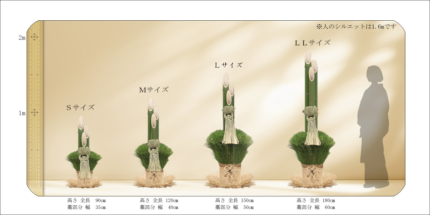 Sサイズ(高さ0.9m)、Mサイズ(1.2m)、Lサイズ(1.5m)、LLサイズ(1.8m)の4種類をご用意しています。
